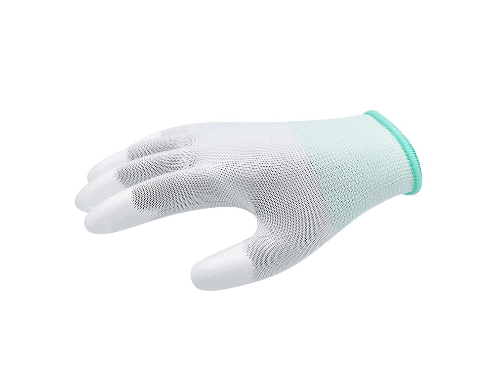 ● 贴指手套由13针涤纶面料和手指涂层为PU胶组成,耐磨性能好。
